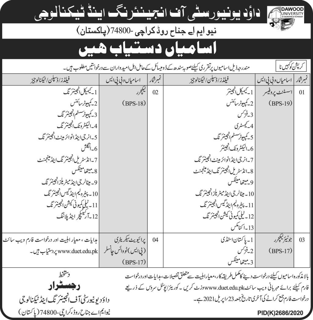 Dawood University of Eengineering & Technology Karachi , Teaching/Faculty Jobs April 2021