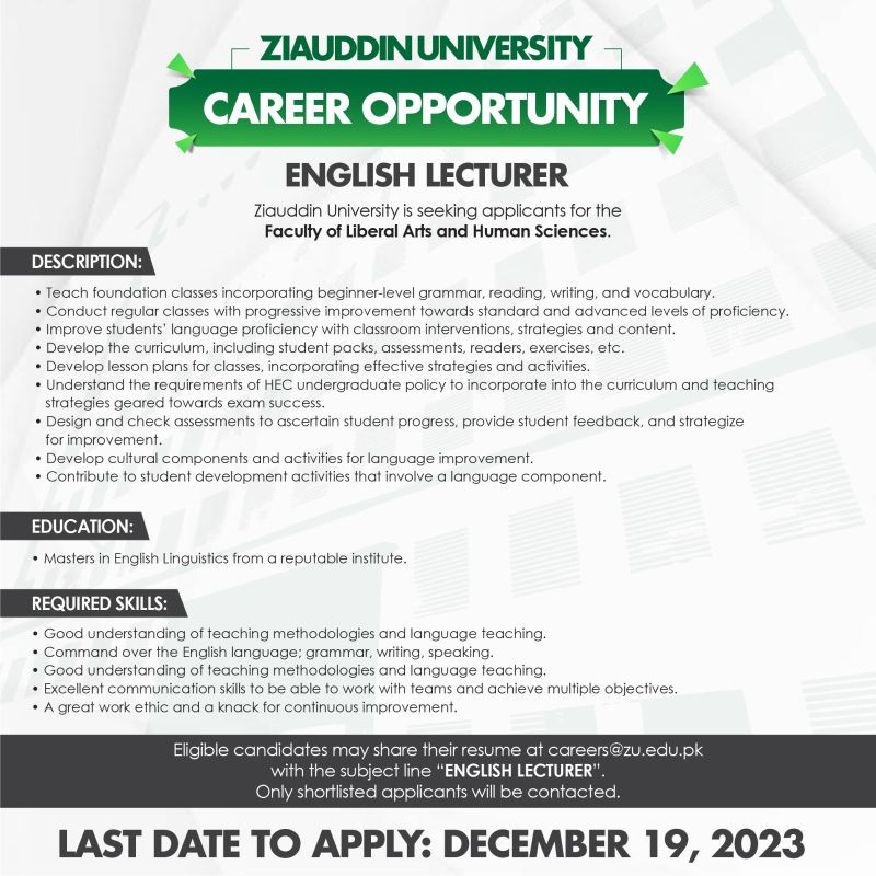 English Lecturer Job at Ziauddin University