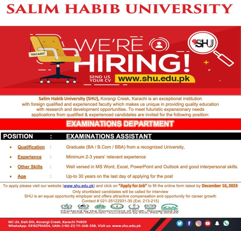 The Examinations Department at Salim Habib University is hiring a full-time Examinations Assistant.
