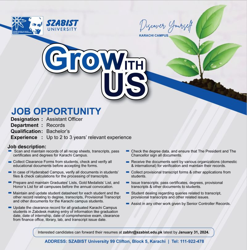 zabhr@szabist.edu.pk along with an updated CV, copy of Highest Degree and Experience Certificates OR send hard copy to HR Office in 79 Building. Position should be clearly mentioned in the subject section. From more info call 111-922-478. Deadline to Apply: 31 January 2024