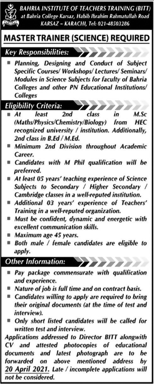 Bahria College Karsaz, Teaching/Facuty Jobs April 2021