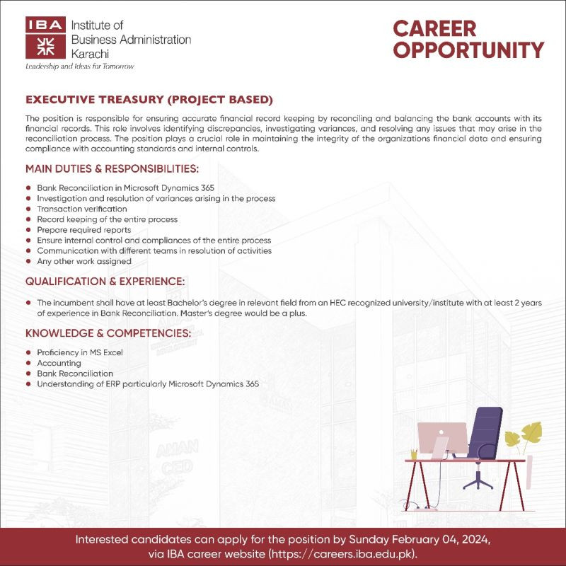 IBA Karachi is looking for a candidate for the position of ‘Executive Treasury (Project Based)’