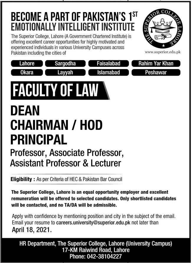 Superior Univeristy Lahore, Teaching/Facutly Jobs Apri 2021