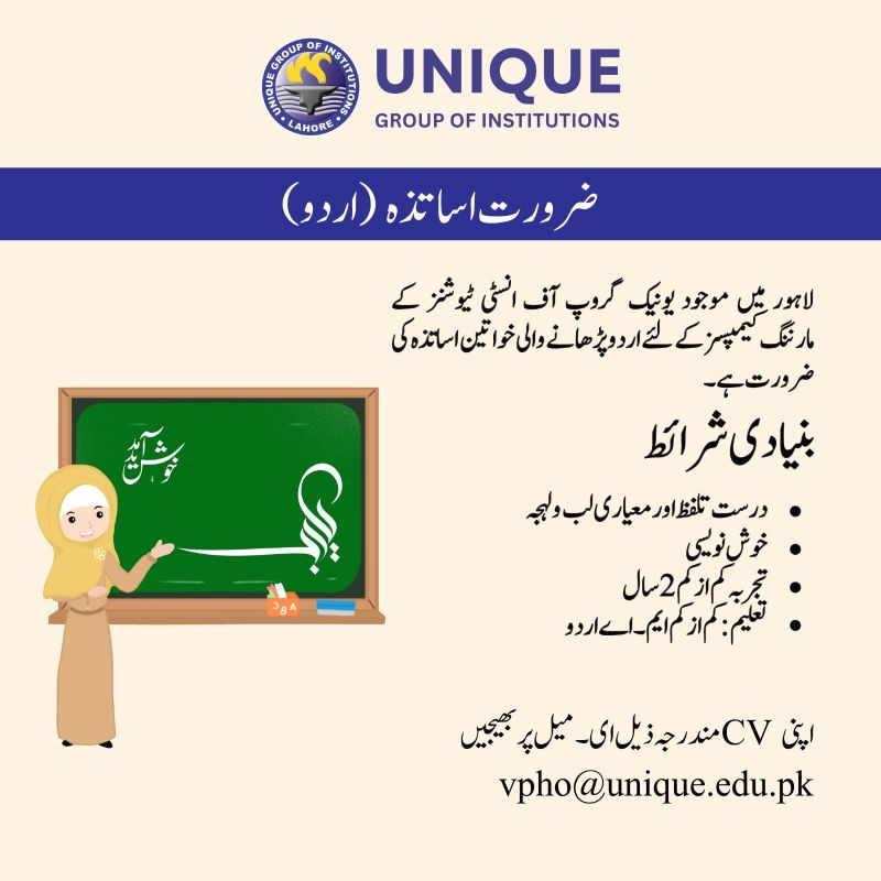 Urdu Teachers Required in different campuses of Unique Group of Institutions.