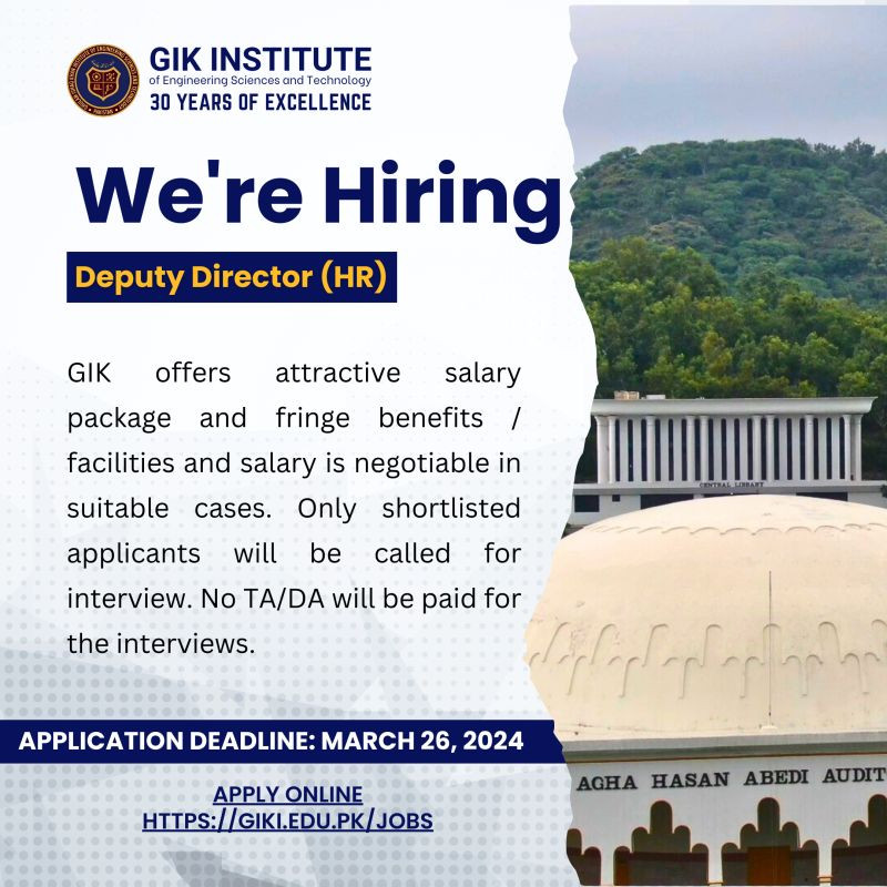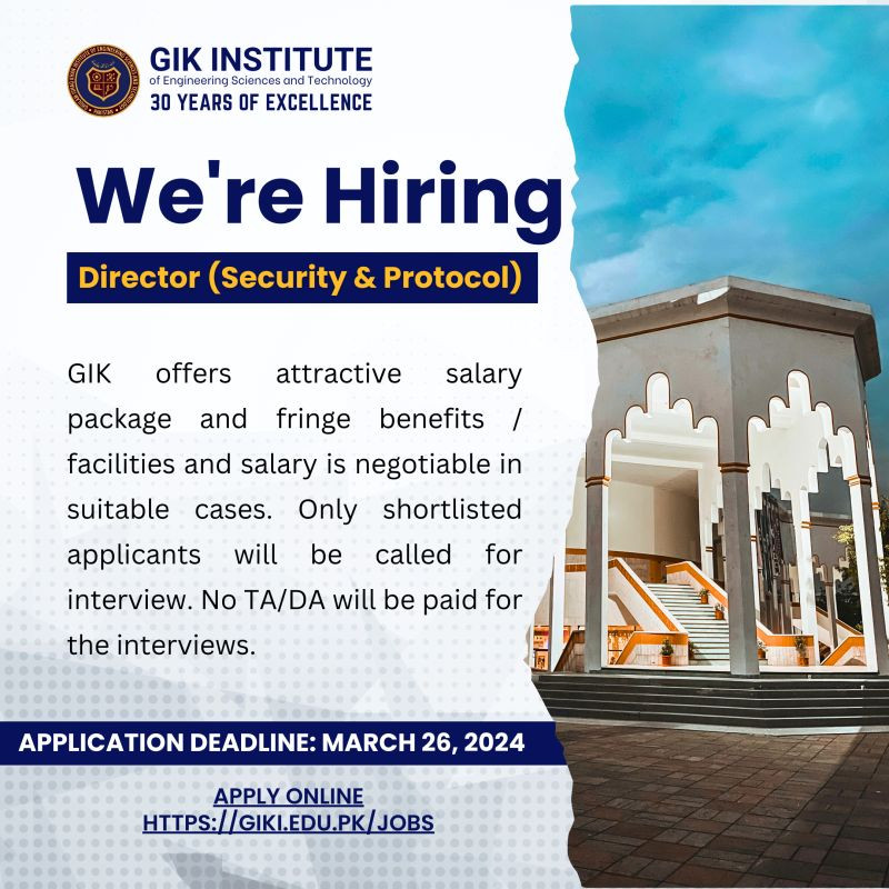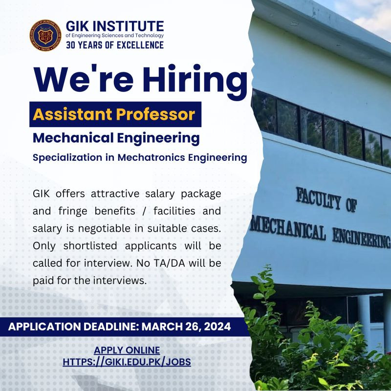 𝐎𝐧𝐥𝐢𝐧𝐞 𝐀𝐩𝐩𝐥𝐢𝐜𝐚𝐭𝐢𝐨𝐧 𝐋𝐢𝐧𝐤: https://giki.edu.pk/jobs