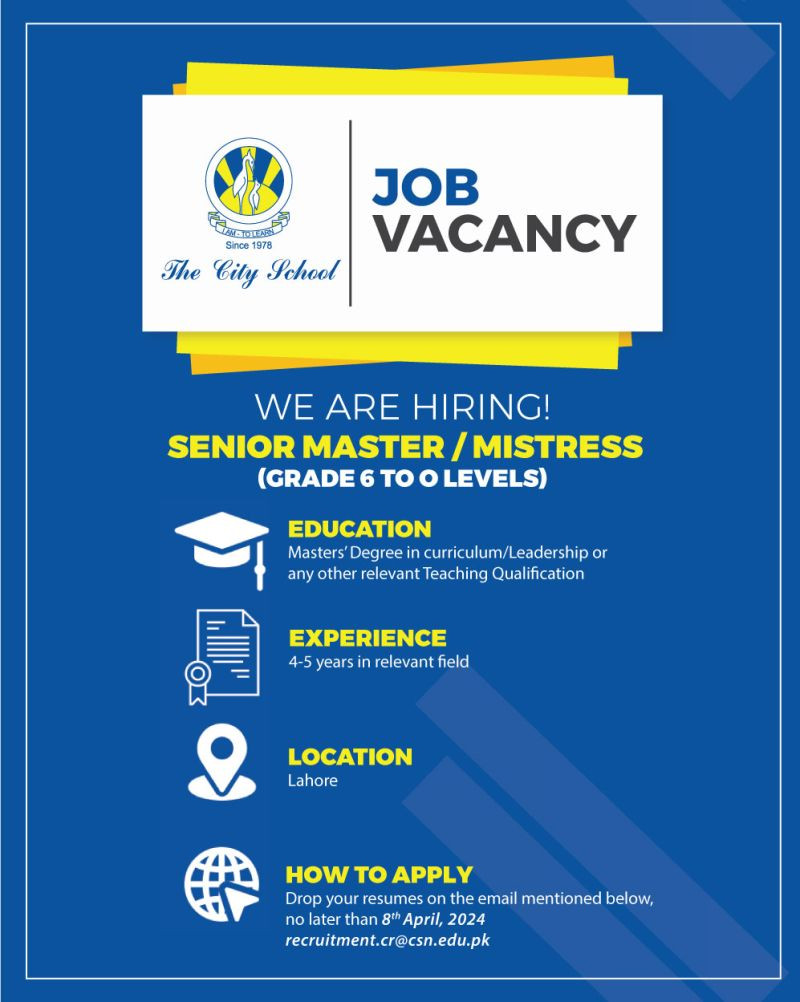 #TheCitySchool is looking to fill the position of Senior Master/Mistress (Grade 6 to O Levels) at their Campus in Lahore.