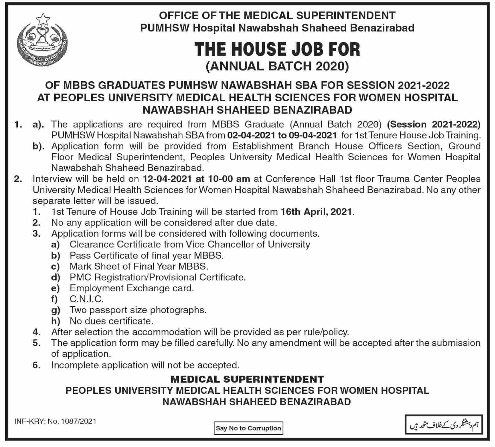 Peoples University of Medical and Health Sciences for Women Nawabshah, Management Jobs April 2021