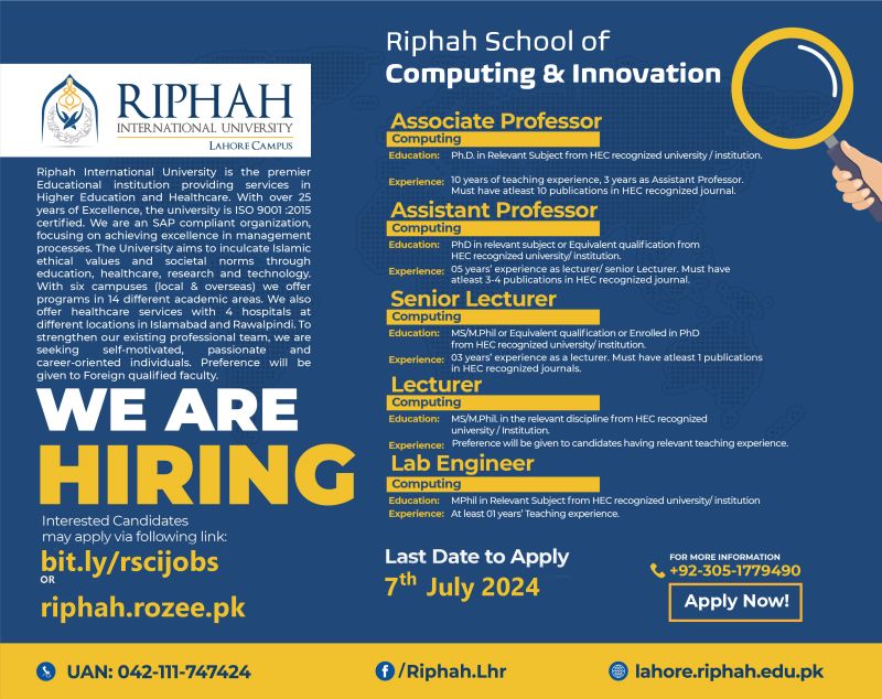 We have multiple faculty positions open at the Computing School of Riphah International University Lahore Campus. Riphah School of Computing & Innovation is one of the leading computing school in Lahore, Pakistan, which offers BS, MS, and PhD programs in different domains of computing. The candidate must have a good research record with sound coding and problem-solving skills. Possessing international certifications from bodies like AWS, Microsoft, Google, CISCO, Huawei, Oracle, ISACA, PMI, ITIL, (ISC)2, EC-Council, etc. will be an added advantage.