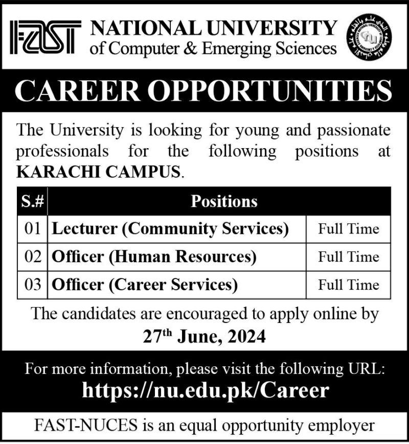 We are looking for hard working and talented individuals for several vacant positions at FAST-NUCES Karachi Campus. Apply now and join our dynamic team.