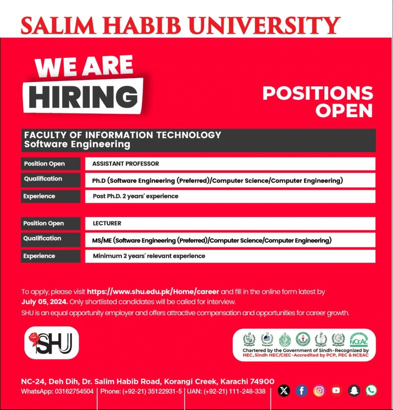 The Faculty of Information Technology at Salim Habib University is hiring a full-time Lecturer and a full-time Assistant Professor.