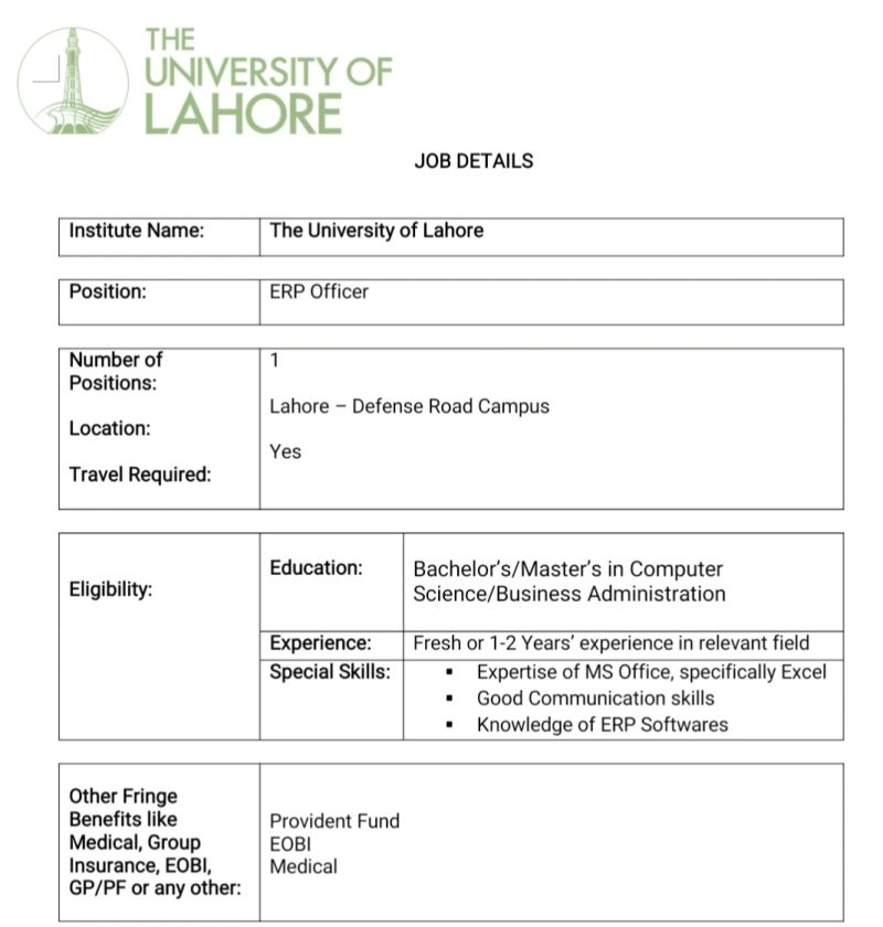 The University of Lahore, is currently seeking to fill the position of “ERP Officer".