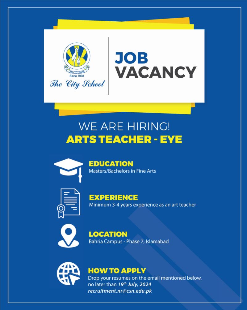 #TheCitySchool is looking to fill the position of Arts Teacher for EYE at their Bahria Campus - Phase 7, Islamabad.