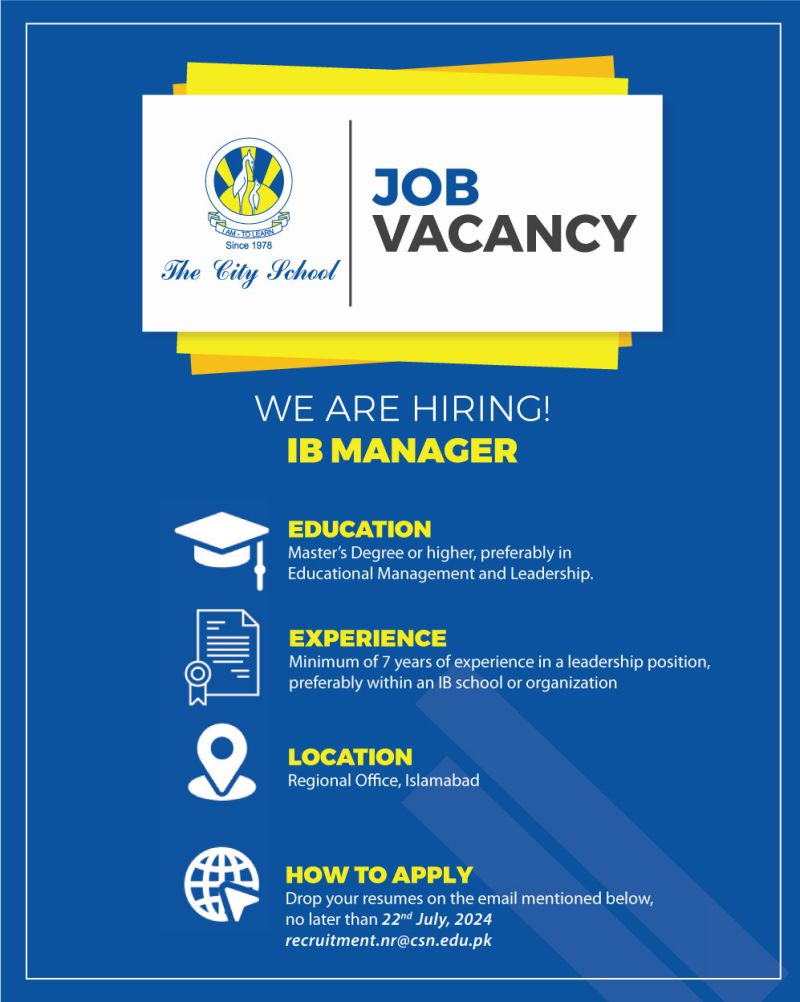 #TheCitySchool is looking to fill the position of IB Manager at their Regional Office Islamabad.