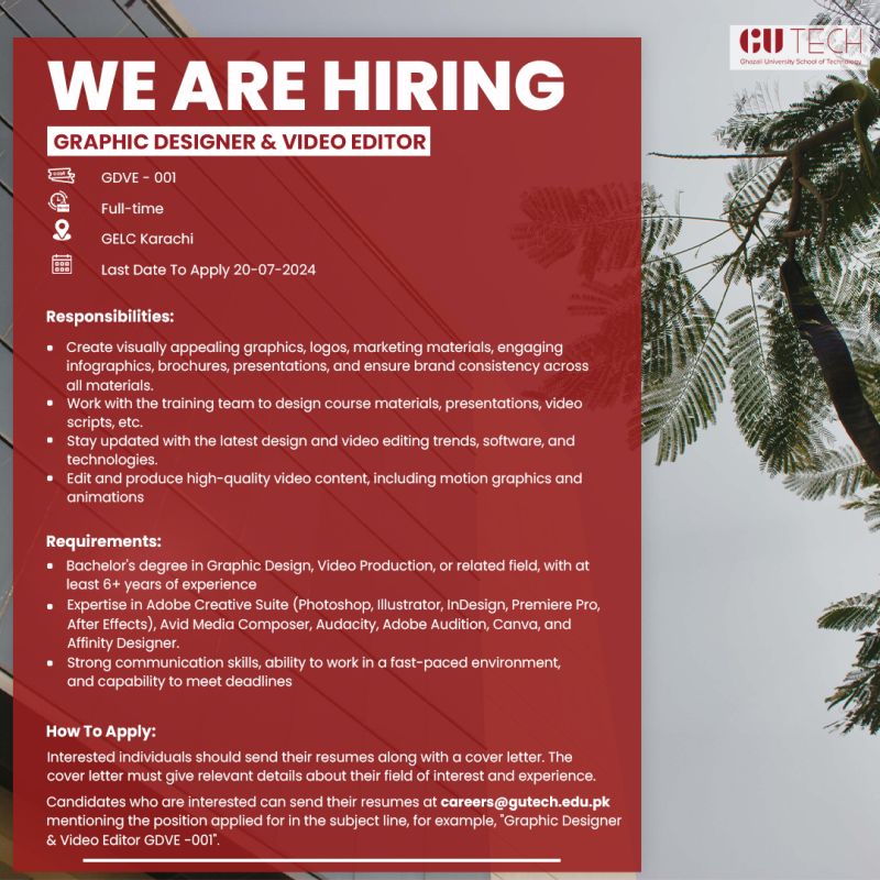 Candidates who are interested can send their resumes at 𝐜𝐚𝐫𝐞𝐞𝐫𝐬@𝐠𝐮𝐭𝐞𝐜𝐡.𝐞𝐝𝐮.𝐩𝐤 mentioning the position applied for in the subject line, for example, “𝐆𝐫𝐚𝐩𝐡𝐢𝐜 𝐝𝐞𝐬𝐢𝐠𝐧𝐞𝐫 𝐚𝐧𝐝 𝐯𝐢𝐝𝐞𝐨 𝐞𝐝𝐢𝐭𝐨𝐫 𝐆𝐃𝐕𝐄 - 𝟎𝟎𝟏”.