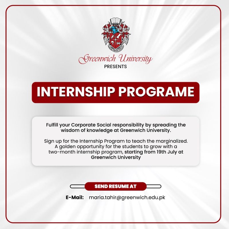 Fulfill your CSR with us at Greenwich University! Join our Internship Program and inspire change by teaching the marginalized. Don't miss this opportunity to make a difference starting July 19th. Email Ms. Maria Tahir, Coordinator Psychology Program at maria.tahir@greenwich.edu.pk