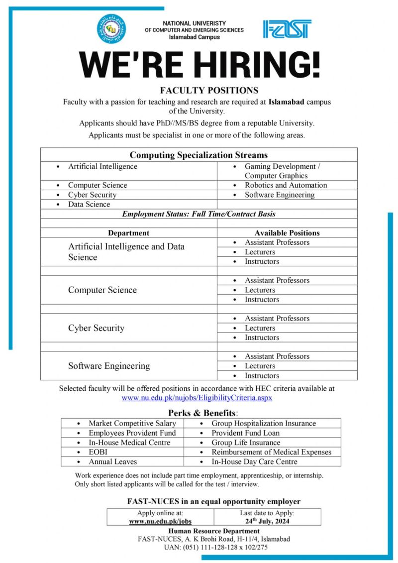 We are looking for talented and passionate individuals for vacant faculty positions at FAST-NUCES Islamabad Campus. We encourage all qualified candidates to apply and join our dedicated team of educators committed to excellence in teaching and research.