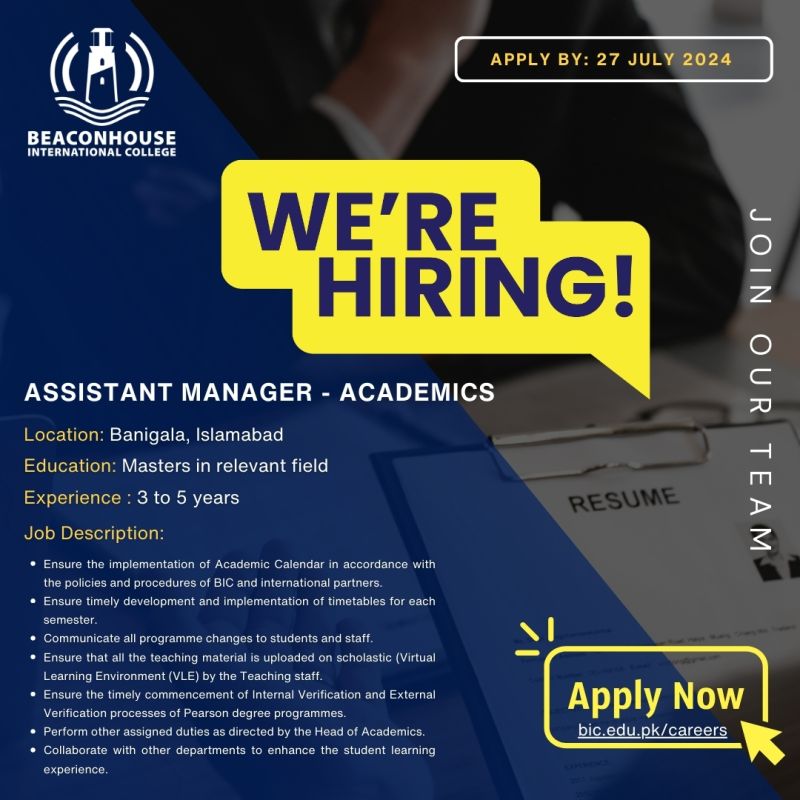 BIC - Islamabad Head Office is hiring for Assistant Manager - Academics position.