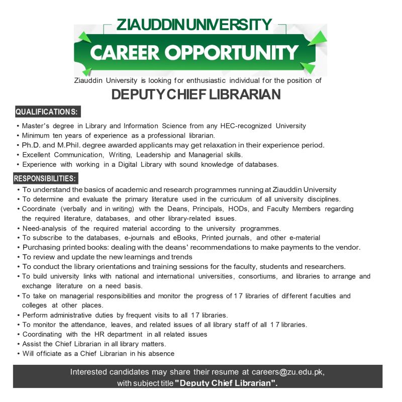 Deputy Chief Librarian Job at Ziauddin University