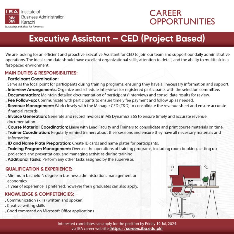 IBA Karachi is looking for a candidate for the position of ‘Executive Assistant - CED (Project Based)’