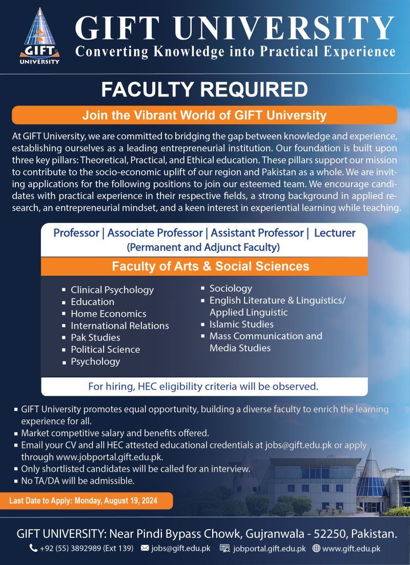GIFT University is inviting applications for various faculty positions in the Faculty of Arts & Social Sciences. This is your chance to be part of a leading entrepreneurial institution committed to bridging the gap between knowledge and experience. We offer opportunities for Professor, Associate Professor, Assistant Professor, and Lecturer (Permanent and Adjunct Faculty) in fields such as Clinical Psychology, Education, Sociology, Political Science, and more.