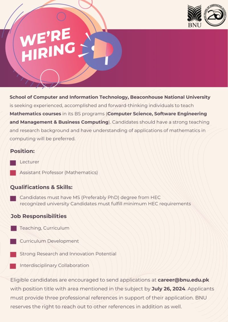 School of Computer and Information Technology, Beaconhouse National University is seeking experienced, accomplished and forward-thinking individuals to teach Mathematics courses in its BS programs (Computer Science, Software Engineering and Management & Business Computing). Candidates should have a strong teaching and research background and have understanding of applications of mathematics in computing will be preferred.