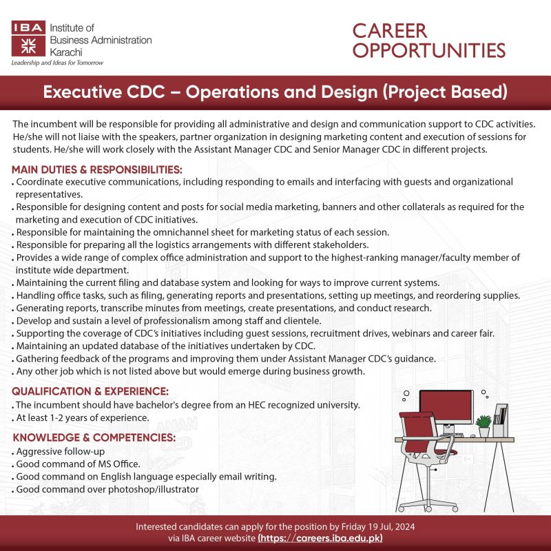 IBA Karachi is looking for a candidate for the position of ‘Executive CDC - Operations and Design (Project Based)