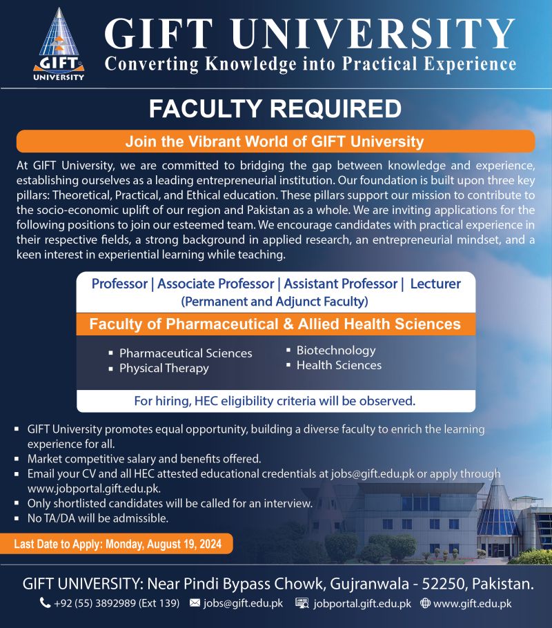 At GIFT University, we are committed to bridging the gap between knowledge and experience, establishing ourselves as a leading entrepreneurial institution. Our foundation is built upon three key pillars: Theoretical, Practical, and Ethical education. These pillars support our mission to contribute to the socio-economic uplift of our region and Pakistan as a whole. We are inviting applications for the following positions to join our esteemed team. We encourage candidates with practical experience in their respective fields, a strong background in applied research, an entrepreneurial mindset, and a keen interest in experiential learning while teaching.