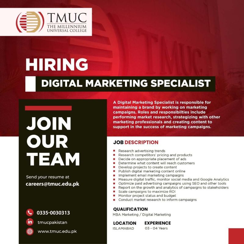 We are seeking dynamic professionals for the position of Digital Marketing Specialist at our Head Office in Islamabad. Please share your resume with careers@tmuc.edu.pk, mentioning the advertised post in the email's subject line.