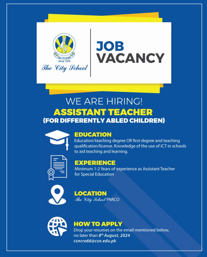 #TheCitySchool is looking to fill the position of Assistant Teacher (For Differently Abled Children) at The City School Parco Campus.