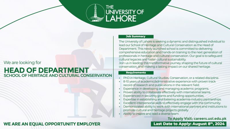 Join UOL's esteemed School of Heritage and Cultural Conservation as the Head of Department. Lead academic excellence and innovative research in cultural preservation. Apply by August 8th, 2024.