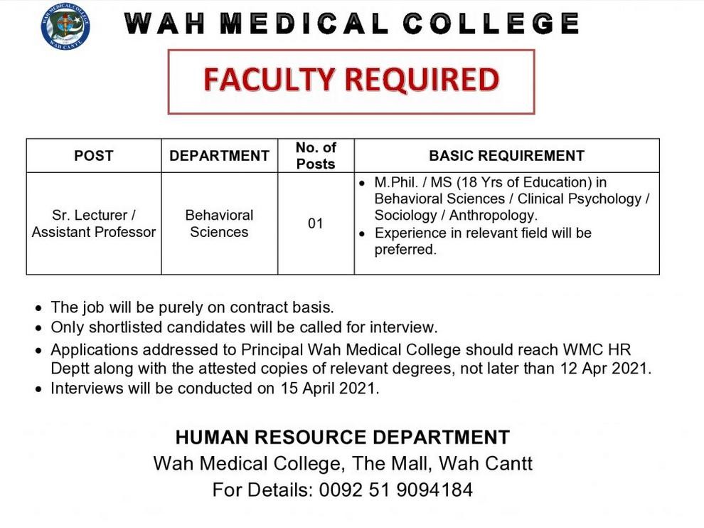 WMC-Wah Medical College, Teaching/Faculty Jobs April 2021