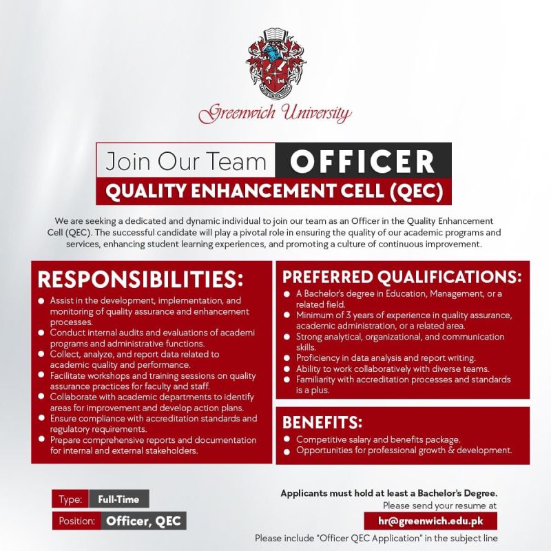 Interested candidates are invited to submit their resumes at hr@greenwich.edu.pk . Please include “Officer QEC Application” in the subject line.