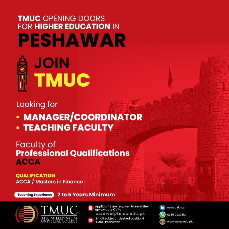 We are seeking dynamic professionals for the Manager/Coordinator/Permanent Faculty positions at our Peshawar Campus. Please share your resume at careers@tmuc.edu.pk, mentioning the advertised post in the email subject line