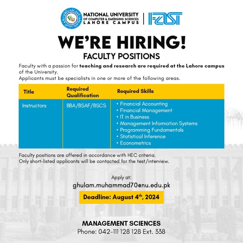 Join FAST-NUCES Lahore as a faculty member. We're seeking individuals committed to teaching and research for vacant positions. Apply now and join our dynamic team.