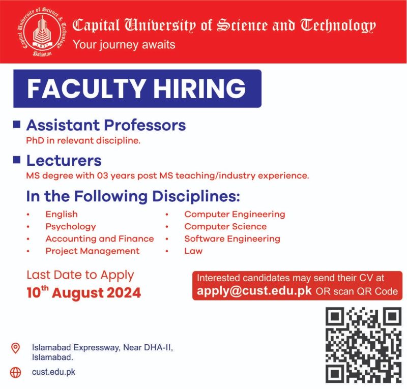 Join Our Team! Application Deadline: August 10th, 2024. Interested candidates may send their CV at apply@cust.edu.pk with the subject line.