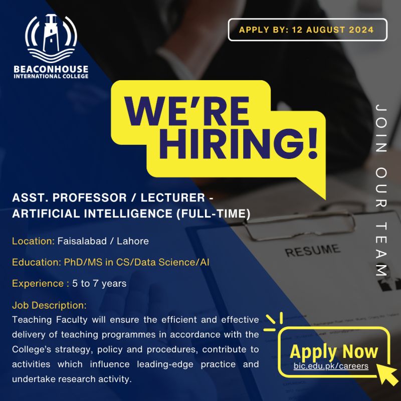 BIC - Lahore & Faisalabad campuses are hiring for Asst. Prof / Lecturer - Artificial Intelligence (Full-time), role.