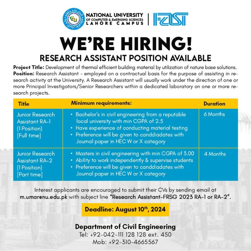 We are looking for hard-working and talented individuals for vacant research positions at FAST-NUCES Lahore. Join our dynamic team and shape future leaders. Apply now!