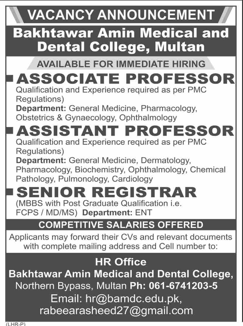 BAMDC-Bakhtawar Amin Medical and Dental College, Teaching/Faculty & Management Jobs April 2021