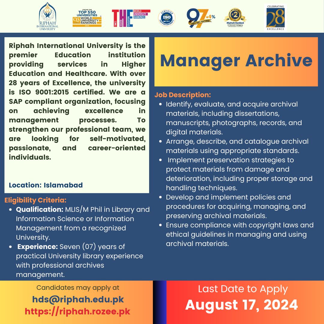 Manager Achieve Job at Riphah International University