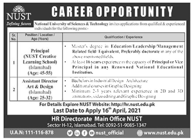 NUST-National University of Science and Technology Islamabad, Management Jobs April 2021