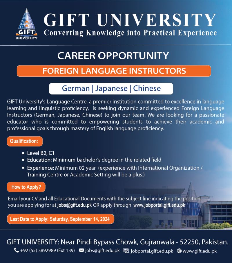 GIFT University's Language Centre, a premier institution committed to excellence in language learning and linguistic proficiency, is seeking dynamic and experienced Foreign Language Instructors (German, Japanese, Chinese) to join our team.