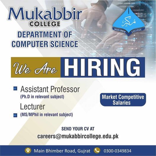 #Department of #ComputerScience, is hiring for the positions of Assistant #Professor (Ph.D. in relevant subject) and #Lecturer (MS/MPhil in relevant subject). Competitive salaries offered. Apply by sending your CV to careers@mukabbircollege.edu.pk. Located on Main Bhimber Road, #Gujrat. Contact: 0300-0349834.
