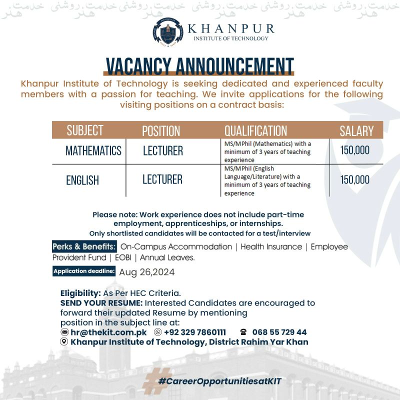 EduJobs Pakistan is an independent platform dedicated to providing information about education sector job opportunities in Pakistan, sourced from prominent newspapers and official institution channels. Our goal is to assist job seekers nationwide by delivering timely updates on available positions. As a precaution, refrain from making any payments if an employer requests fees for activities such as shortlisting or interviews. Ensure that you apply according to the instructions and dates specified in the original job advertisement. EduJobs Pakistan is not liable for inaccuracies or misrepresentations in job ads. If you have any uncertainties, we recommend visiting the institution’s official website or contacting them through their official contact numbers for verification. Please note, EduJobs Pakistan operates independently and is not affiliated with any government entity.