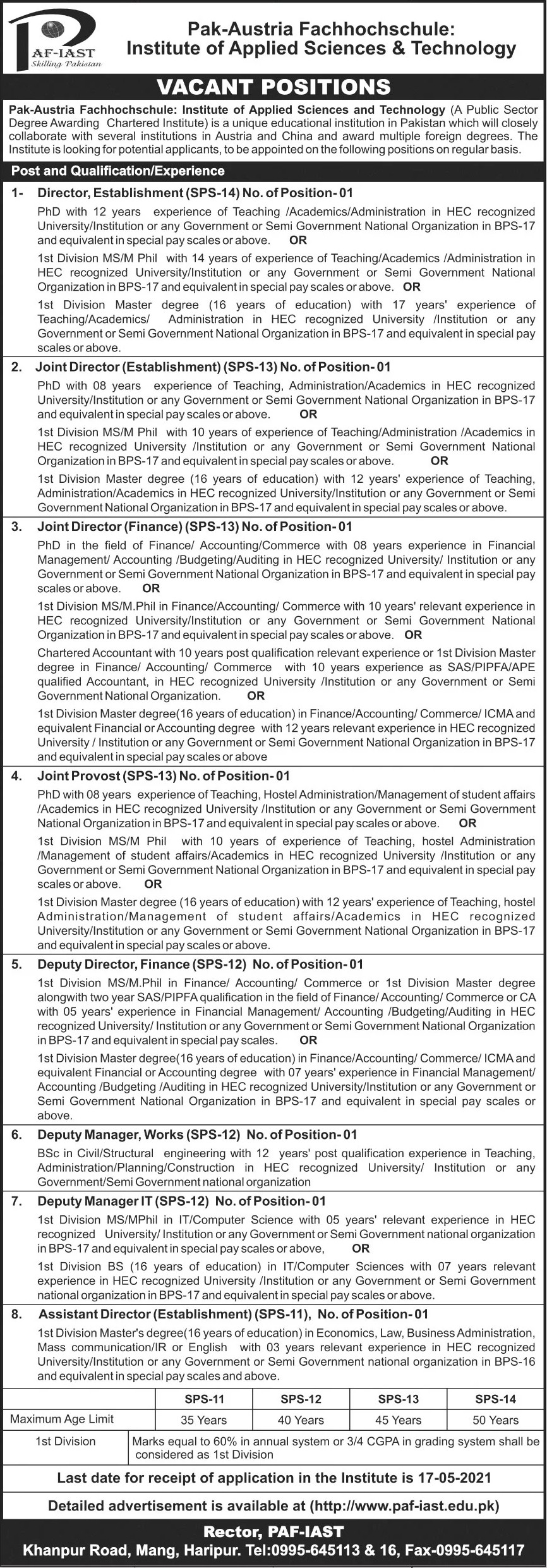 PAF-Pak-Austria Fachhochschule Institute of Applied Sciences and Technology, Management Jobs April 2021
