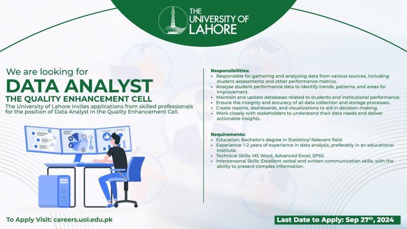 UOL's Quality Enhancement Cell is seeking a Data Analyst to drive data-driven strategies for academic excellence. Join us in shaping the future of education with your expertise!