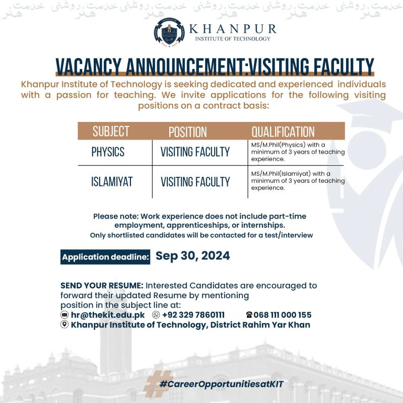 Interested candidates may apply by sending their CVs to hr@thekit.edu.pk or via WhatsApp at 0329-7860111.