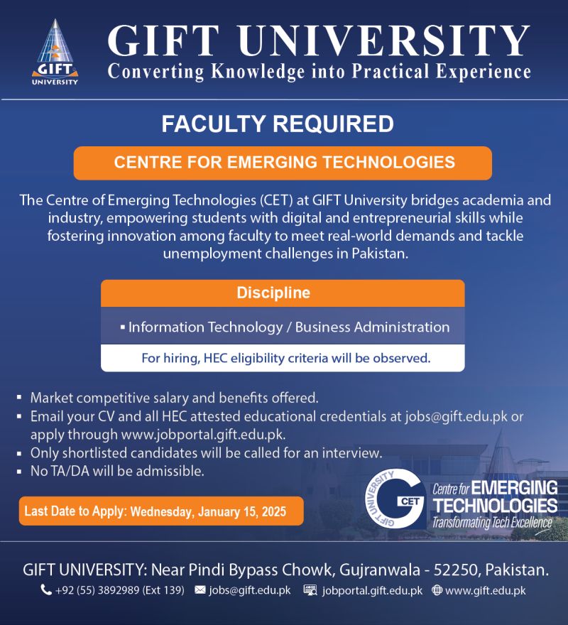 GIFT University is hiring passionate and qualified faculty for the Centre for Emerging Technologies - GIFT University. This is your chance to shape the future by empowering students with digital and entrepreneurial skills to tackle real-world challenges. If you specialize in Information Technology or Business Administration, and meet HEC eligibility criteria, apply now to join a dynamic academic environment with market-competitive benefits.