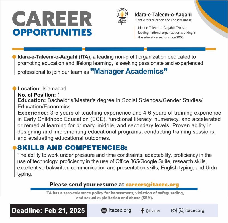 Manager Academics Jobs at Idara Taleem o Aagahi
