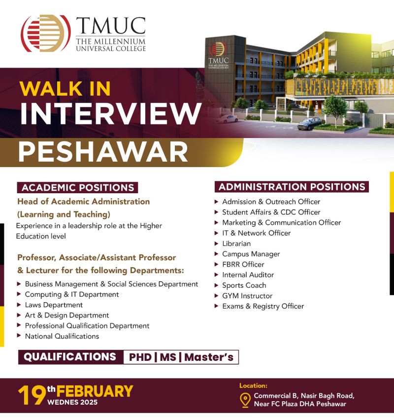 Walk in Interviews for Teaching and Non-Teaching Jobs at TMUC Peshawar