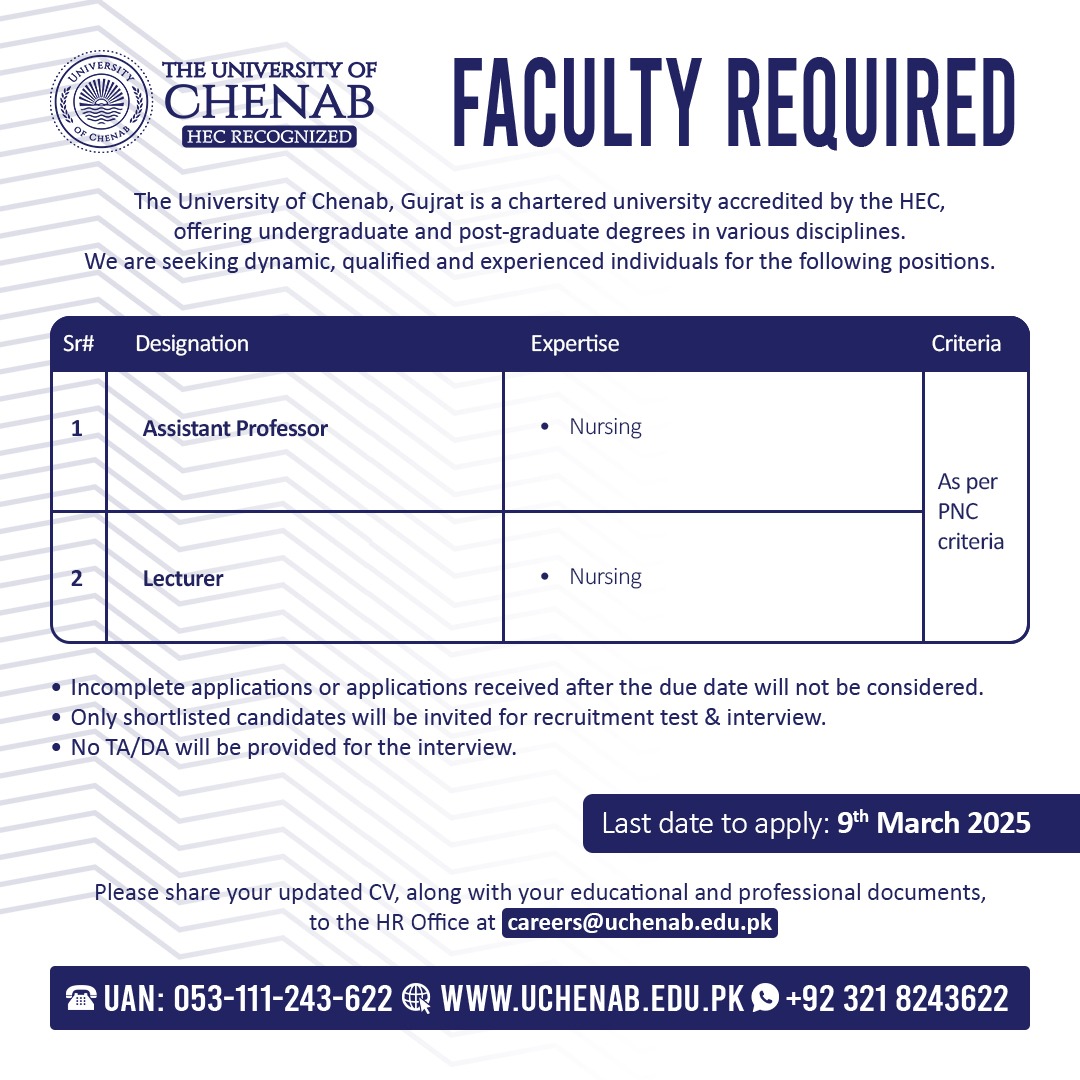 Assistant Professor and Lecturer Jobs at University of Chenab